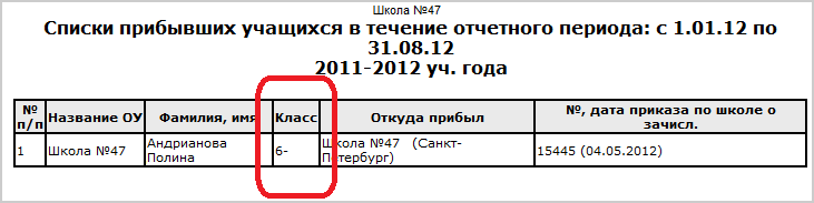 Если в отчёте присутствует графа "Класс", то для "прикреплённых" учащихся в этой графе выводится параллель прикрепления с дефисом, например: