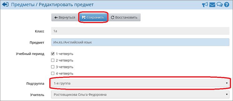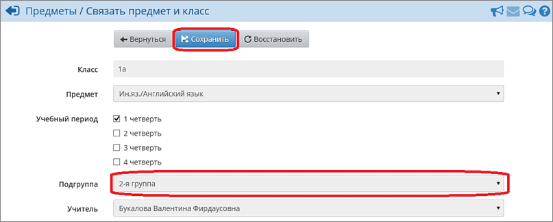 Чтобы зачислить учеников в подгруппы, необходимо перейти в раздел Обучение->Подгруппы и отметить галочками нужных учеников для конкретной подгруппы, затем нажать кнопку Сохранить.