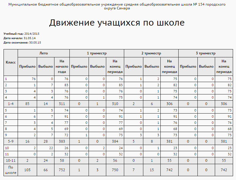 Этот отчет предоставляет данные о прибывших/выбывших учащихся за каждый учебный период. В таблице указано общее число прибывших/выбывших по классам/параллелям, ступеням и по школе в целом. Данный отчёт ориентируется на даты соответствующих приказов о движении в "Книге движения учащихся".